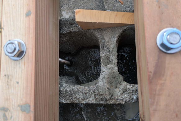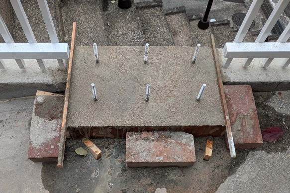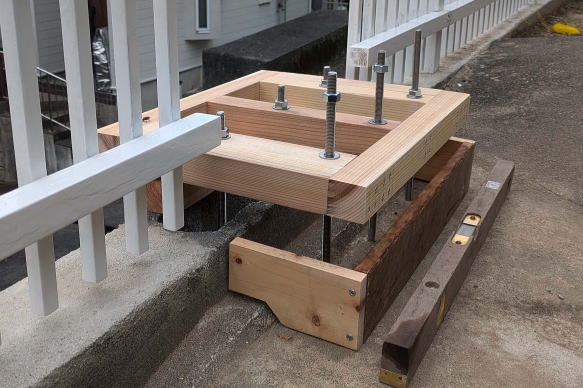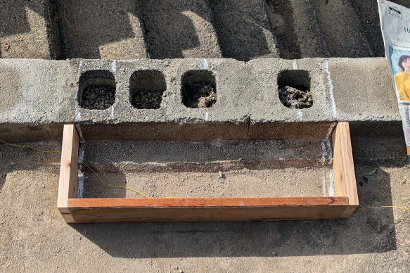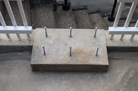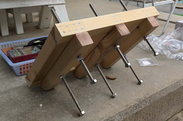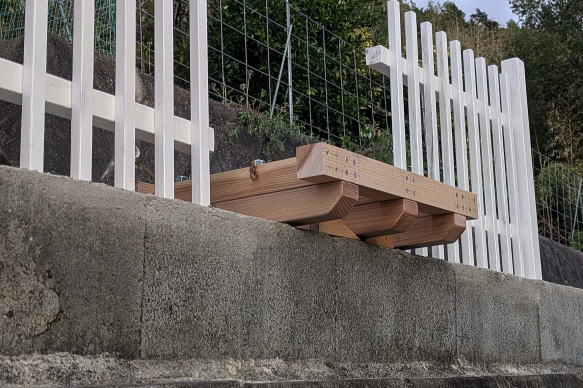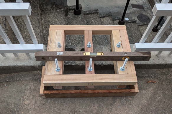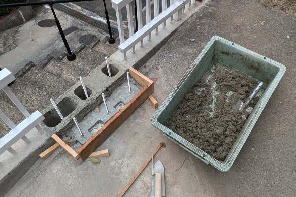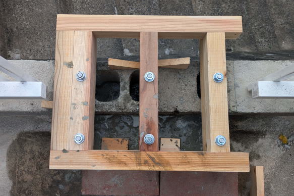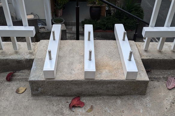![]() 階段上部の途中にポスト兼宅配ボックスを設置することにした。半分は既存の穴開きブロックにかかることになる。板でモルタル枠を作って置いてみたところ。 ![]() 底部材を作る。下に付いている3本の角材は脚にあたる部分。ステンレス製寸切りボルト6本を取り付け、下部をモルタルで埋めて固定することにした。 ![]() 設置予定場所に底部材を置いて水準器で水平になるように調整する。柵の途中に設置するつもりなので、左右の柵もあらかじめ作っておいた。ただ左側の柵は一部、デザインを変更したので、あとでまた作り直した。 ![]() 横から見たところ。後方3本の寸切りボルトが長過ぎるが、適当なサイズのボルトがなかったので、長めのものを購入し、ぴったりの寸法になるように切断した。 ![]() 超強度セメントは、砂とは混ぜずに既定量の水とだけ混ぜて使用する。ボルト下部に取り付けたナットとワッシャごと埋めるように流し込んだところ。底部材が水平になるように三角形の木材を利用して細かい調整をする。セメントを流し込んだあとも水平を維持していることを繰り返し確認する。底部材右端は工事の都合上、取り外してある。この段階では後方のボルトは切断して、長さはぴったりになっている。 ![]() 前方ボルト3本は、穴開きブロックと固定することになる。やはり超強度セメントを穴の中に流し込み、棒で繰り返しつついて隙間ができないようにした。 ![]() 階段側から見たところ。斜めにカットした角材が脚。ポスト背後の空間を確保するために階段側に10センチほどはみ出す位置にした。 ![]() 超強度セメントが固まったところで、一旦、底部材を取り外し、再度、モルタル接着強化剤を表面に塗って乾かしてから通常のモルタルを枠の中に詰めていく。 ![]() モルタルを詰め終わったところ。 ![]() モルタルが固まってから枠を取り外すと、基礎土台部分が完成である。 ![]() 油性白ペンキで塗装した脚を戻し、接着防止用のプラ板を載せたところ。この段階のまま、以後1年間、放置してしまったわけだが、今年2025年10月から以後の作業を開始。11月末にようやく完成した。その過程を今後、数回に分けて紹介する。→次回・フレーム製作編 |