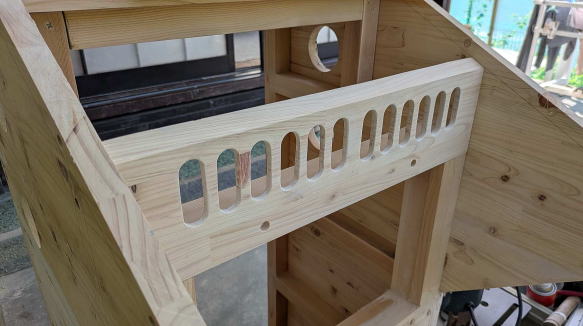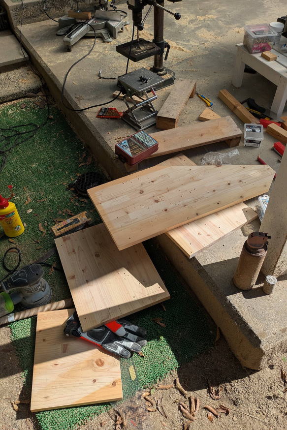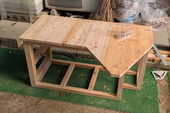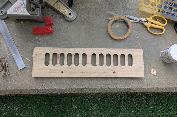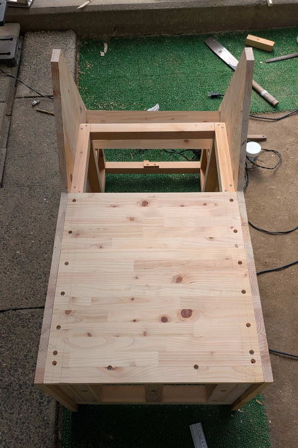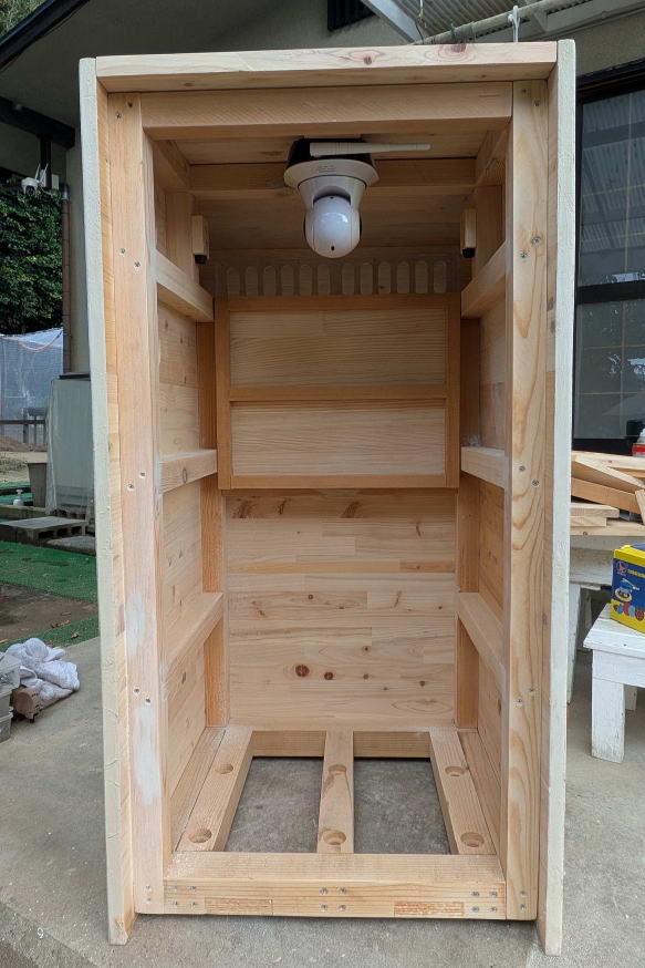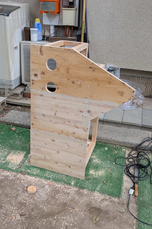 ![]() ボックスの外壁となる厚さ2センチの集成材を切り出す。この集成材は、「パソコンラック兼サイドテーブル」の天板としても使用した。買ってきた集成材から何枚かに分けてスライド丸鋸で切断し、固定用のネジ穴を開けた。 ![]() フレームに合わせて片側だけ集成材を張ったところ。集成材に開けた二段穴に木ネジを入れて固定し、穴に化粧材を埋めて、ネジ頭が見えないようにする。この段階で板の形状を見ても、完成形は想像できないかもしれない。なんで「くちばし状」なのか、あとでわかります。 ![]() 夏場、庫内は高温になることが予想されるため、少しでも風が通り抜ける構造にする方がベターと思われた。宅配ボックス内に荷物が長時間置きっぱなしになることは、ほとんどないと思うが、仮にそうなってしまった場合。例えば食品やサプリみたいものだと、好ましくない。そこで天板を除く残り5面すべてに通気口を設ける構造にし、左右と裏側の通気口には雨が侵入しないようにガラリを取り付けることにした。そこで、この段階でガラリの径に合わせて穴を開けておいた。ちなみにガラリとは、換気部材のこと。今はネットで各種ガラリが簡単に手に入るので、内側にステンレスネットが張られて虫が侵入しにくい製品を見つけて計7個注文し入手しておいた。 ![]() 左右と前方下部に板を張り終えた。「くちばし」の間にある開口部が、投入口になる予定だ。 ![]() その開口部の幅を変更するために左右に材を追加。接着剤を塗ってクランプで固定。なぜ幅を変更する必要があるかというと、投入口には、当然、扉が付くわけだが、フレームだけでは、どうしても左右にわずかな隙間が開いてしまうから。この説明だけで意味を理解した方は、この手の工作に慣れておられますね。 ![]() 市販のガラリだけでなく、別に通気口部材も自作した。同じ集成材から写真のように加工して、あとで裏側にネットを張ることにした。 ![]() その自作通気口部材は、投入口上部に使う。ここは天板が斜めになるので、部材もそれに合わせて斜めに切断してある。 ![]() 天板も切り出して仮置きしてみた。左右の側板が「くちばし」状になっていた理由。これでわかりましたよね。天板は残りの集成材の寸法がちょっと足らなかったので、あとでダボ継ぎした。板が少しズレている箇所があるのは、仮置きだから。 ![]() 投入口を下から覗いたところ。ネジ穴に埋めた化粧材が、表面から少しだけ出ているが、のちにノコギリで切り取って平らにした。今はまだ埋めたまま。また天板の先に切断ムラができたりしもしているが、こういう部分的な問題点も少しずつ修正していった。 ![]() 今回の宅配ボックスも、前回のそれと同様、ネットワークカメラを取り付ける予定で、上部に収納スペースを用意した。写真は、余っていたネットワークカメラを仮付けしてみたところ。8年前に最初に買ったIPカメラで、画素数はあまりよくないが、あくまで郵便や荷物が届いているかいないかがわかればいいので、これで十分。なお、投入口の扉を写真のように取り付けてみたものの、普通の蝶番を使用しているため、当然のことながら、投入後にバタンと音をたてて閉まっちゃう。わかってはいたが、実際に閉まる様子を見ると、うーん、なんだか粗雑でカッコよくない。できれば、ゆっくり静かに閉まるようにしたい。いろいろ検討した結果、理想的に解決させることに成功したのだが、その点はまた後述する。ちなみにネットワークカメラの左右にあるのはゴム足付きのストッパー。荷物の投入時に勢いよく開閉部が上がると、カメラに当たってしまうために取り付けた。ただ開閉部のしくみを根本的に変えたので、このストッパーも取り付け位置を変更することになった。とりあえず、ボックスの外観を形成する板張り作業は、これでほぼ完了である。→次回・投入口加工編 |