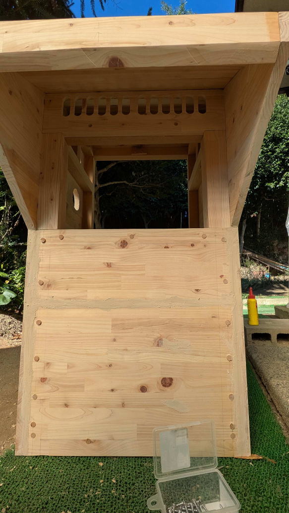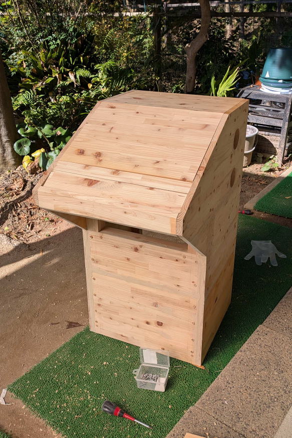 | フレームができたので、続いてボックスの外観となる板を張っていく。当初、厚さ1センチくらいの板を使おうと思っていたが、ホームセンターで手ごろな集成材が、しかも比較的安い値段で山にして売られているのを発見。厚さが2センチもあったが、これはボックスに使えるのではないか。厚いということは、それだけ重くなることを意味するが、逆にいえば、それだけ丈夫になる、ともいえる。またある程度、厚さがある板の方が、工作はかえってしやすかったりするのも事実。「この集成材で板張りしよう」と即断。 買ってきた集成材は、寸法が合わないので、そのままでは使えない。何枚かに分けて切り出し、フレームに合わせて貼り合わせるしかない。そこで天地方向で3段に分けて切り出したが、左右の「くちばし」下部だけ、ちょっと足らなかったため、ここだけ別途、切り出して追加することになった。ダボ継ぎにする手もあったが、フレームに半分かかるようにして木ネジ止めにする方法で追加した。 さらに通気口用の穴を開けたり、投入口の加工をしたりすれば、ほぼ板張り作業は完了だが、この段階では、まだ隙間やわずかな段差があったりするので、パテで隠したり、サンダーをかけて平坦にしたりする作業も必要だった。しかも、何度かやり直しも発生した。 次回は、投入口加工編。実は簡単そうに見えて、思ったほど簡単でもなく、結構苦心した。いろいろ工夫が必要だった。その話しを。 |