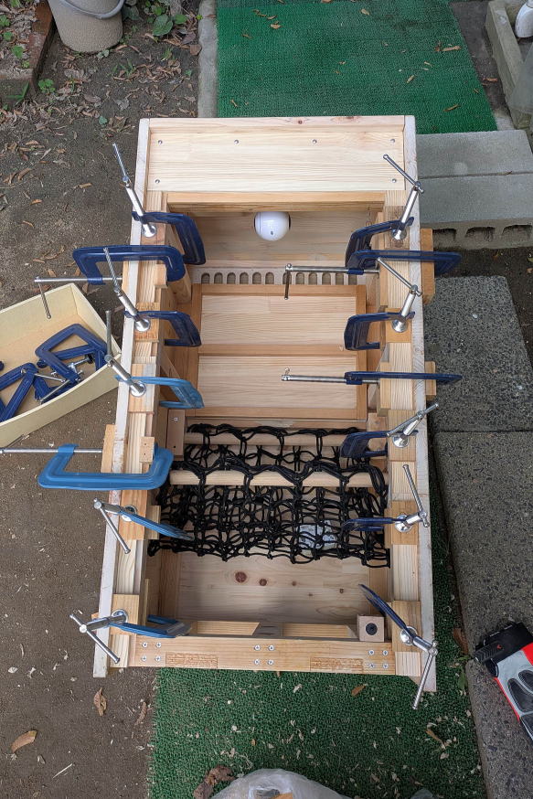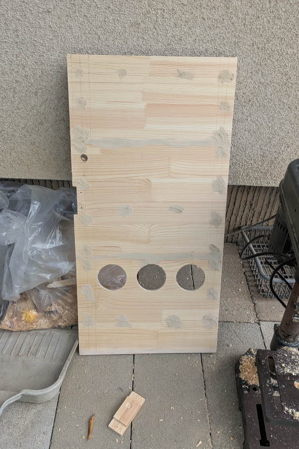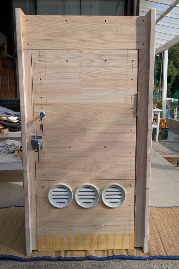 ![]() 取り出し口に薄い角材を接着し、14個のクランプで固定したところ。左側はフレーム材との段差が重ねしろになる。一方、右側には蝶番を付けるので、こちらには当然、重ねしろはないが、あとで水が入らないように内側にスポンジテープを貼っておいた。この時はまだ投入口に最初の扉が付いている。 ![]() 扉にも通気口を設けることにした。3つの通気口の穴を開けてガラリ(換気部材)を仮に取り付けてみた。ついでに蝶番やシリンダー錠、取っ手も付けてみて問題がないかどうか確認。取っ手はその構造と寸法上、写真のような加工が必要だった。扉の下端に貼ってあるのはマスキングテープ。わずかに寸法が合わないことに気づいたので、補修材を追加して木工ボンドで接着したため。 ![]() 扉の開け閉めができ、鍵もかけられることを確認したので、すべての部品を取り外し、ネジ穴にパテを塗って隠した。このあとサンドペーパーでパテ表面を平らに整えた。下にあるのは、シリンダー錠の裏側に取り付ける部材。これで取り出し口の加工は終わり。次回→本体外面塗装編 |