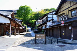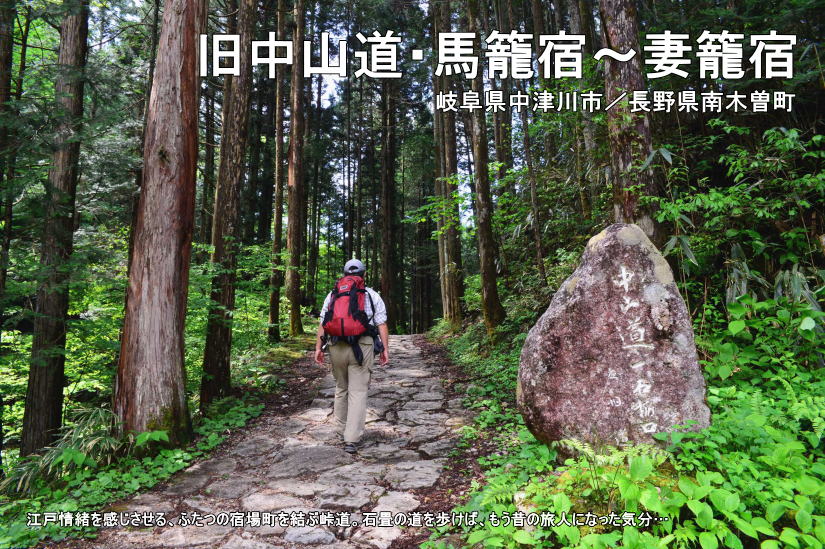 ■コース概略 日本橋から大津宿(現在の滋賀県)まで続く中山道六十九次(なかせんどうろくじゅうきゅうつぎ)の宿場町のうち、馬籠宿(まごめじゅく)と妻籠宿(つまごじゅく)を結ぶ区間は、部分的ながらも石畳の道が続き、史跡等の見どころも多い。しかも江戸情緒あふれる宿場町の佇まいも素晴らしい。そのため街道歩きの定番コースになっている。 最高地点は標高790m(現地標識では801m)の馬籠峠だが、どちらから歩き始めても緩やかな登りなので、家族連れでも無理なくこなせる。ただ、妻籠よりも標高が高い馬籠からスタートする方が、全体に下りが多くなるので楽。そこで本項では馬籠→妻籠の行程を紹介したい。馬籠宿と妻籠宿を結ぶ路線バスも運行されており、車利用の場合でも歩き終えたらバスで起点に戻れる。 コースは岐阜県中津川市と長野県南木曽町(なぎそまち)にまたがるが、スタートを岐阜県側の馬籠宿としたので、「東海北陸エリアの道」として扱った。また写真は5月と11月に撮影したものを混ぜて使用している。11月撮影の写真の主なものには、その旨書いておいた。 |