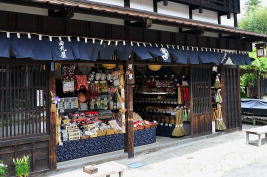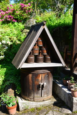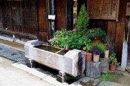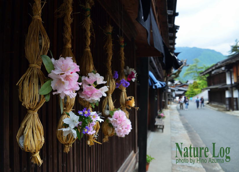 ![]() 52 馬籠も妻籠も、街道情緒演出のためにきめ細かい工夫が、あちこちにされている。江戸時代には、こんな花飾りを作る習慣はなかったかもしれないが、観光客に対する、ちょっとした気遣いが好印象である。宿場町の風情にも合っている。