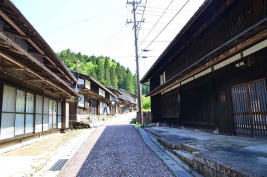 ![]() 57 妻籠宿の街並み。出梁造(だしばりづくり)や竪繁格子(たてしげこうし)などが特徴の建物が並び、江戸情緒たっぷり。町並み保存運動の嚆矢(こうし)となった地域だけに、味わいのある建物がよく残されている。