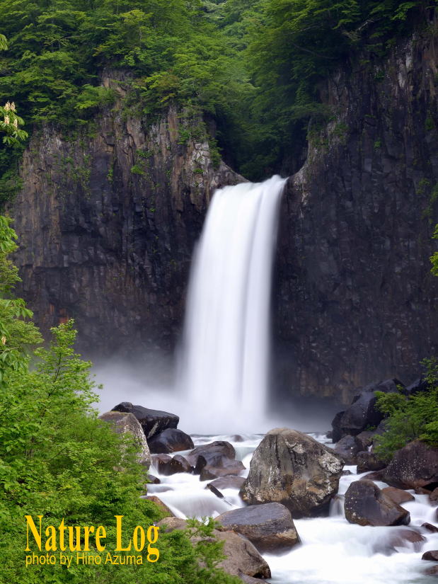 読み/なえなたき 位置/[36°51′00″][138°07′58″] 落差/55m 観瀑歩道/有(駐車場から徒歩15分) 探勝レベル/ファミリー向き 指定/日本の滝百選 一般に知られている苗名滝は、実は一の滝で、上流に向けて二の滝から四の滝が並んでいる。昔は滝の落水音が激しく、まるで地震のような振動だったことから地震滝と命名され、「地震」と書いて「なゐ」と呼んでいた。それが「なえ」に転訛したとされる。何年か前に大駐車場や砂防堰堤が整備され、付近の状況は大きく変わっている。最後の吊り橋や終点の観瀑台に立つと、特に雪解け水を集める春から初夏にかけて、すさまじい水量を落とす姿を望まれ迫力がある。ちなみに上流には笹ヶ峰ダムがあるが、利水ダムなので必要な水は常時流される上に、途中で支流も流れ込むため、ダムによって苗名滝の景観に大きな影響が及んでいるわけではないそうだ。 |