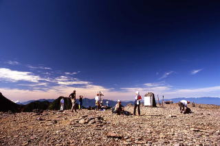 八ヶ岳連峰の中でも硫黄岳は、展望の山として人気がある。もちろん主峰の赤岳など、ほかにも展望に優れた山はいくつもあるが、硫黄岳はこうした南八ヶ岳の主稜線に連なる峰々をまとめて一望できる位置にあり、そのパノラマがなんといっても素晴らしい。しかも車利用が前提になるものの、山麓の桜平を起点にすれば、山頂までは比較的短時間で到達できるのも人気の理由のひとつと思われる。 山頂は広く、一見、穏やかだが、北東側は爆裂火口跡の断崖があって佐久側に切れ落ちており、険しさも兼ね備えている。また北に目を向ければ、双耳峰の天狗岳や蓼科山、さらには頸城山塊と北アルプスなども並び、総じて展望のレベルは高い。 快晴時は問題ないが、ガスがかかると広い山頂は迷いやすい。所々に立つケルンは視界不良時の案内目的で立てられている。 |