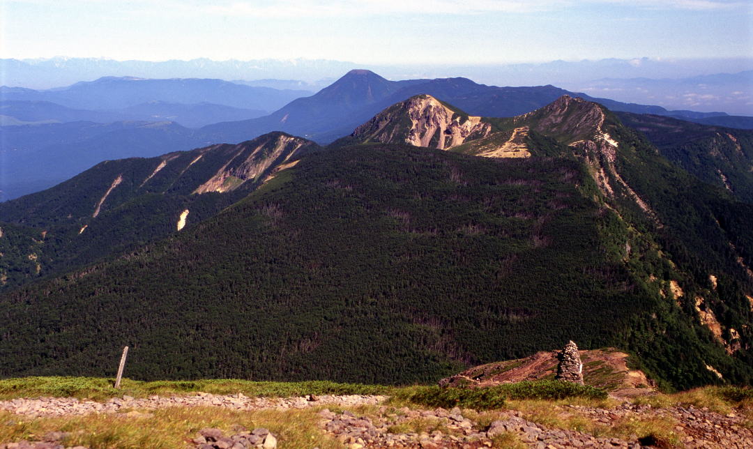 カーソルを写真に合わせると山名等の見える場所の名前が表示されます![]() 硫黄岳山頂手前から望む南八ヶ岳の主稜線。さすがに赤岳は迫力がある。右手は南アルプス(2007.08) ![]() 山頂から北側の眺め。ふたつのピークを持つ東西の天狗岳が近い。蓼科山の後には頚城山塊と北アルプス(2007.08) ![]() 荒々しい爆裂火口跡。その奥には佐久平。さらに浅間山などが連なる(2007.08) |