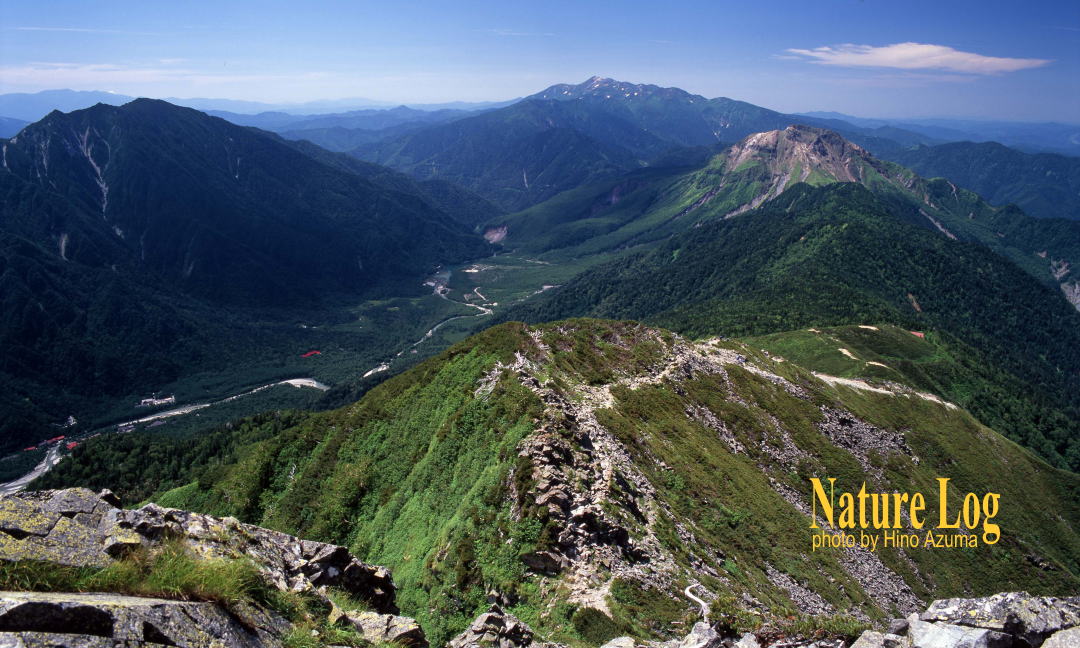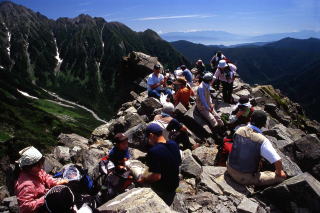 カーソルを写真に合わせると山名等の見える場所の名前が表示されます![]() 西穂独標から奥穂高岳や前穂高岳方面を望む。写真から外れているが、左側には西穂高岳も間近に見える(2005.07) ![]() 南側に目を転じれば、霞沢岳や上高地、乗鞍岳、焼岳が並ぶ(2005.07) |